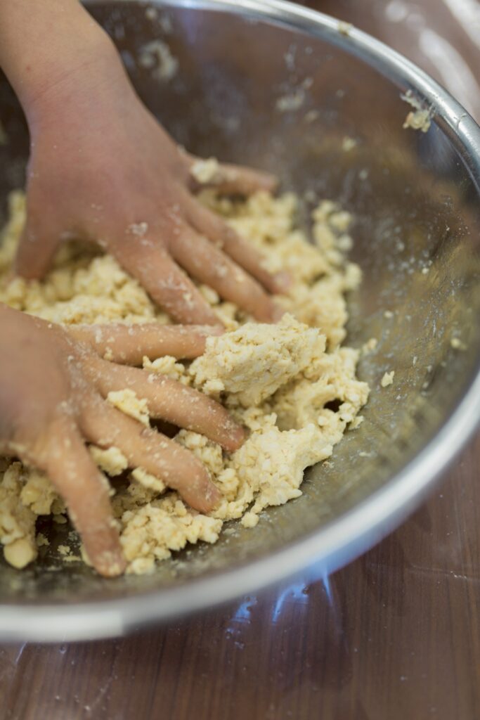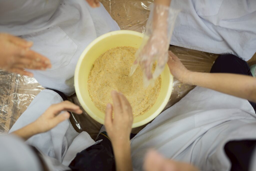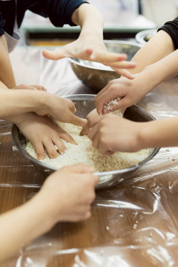 今回の味噌は、マユコベ自然農園のまーやん・ゆっこさんの手と、麹職人さんの手、キッチンティーチャー織田さん、そして子どもたちの「手」のコラボレーション。