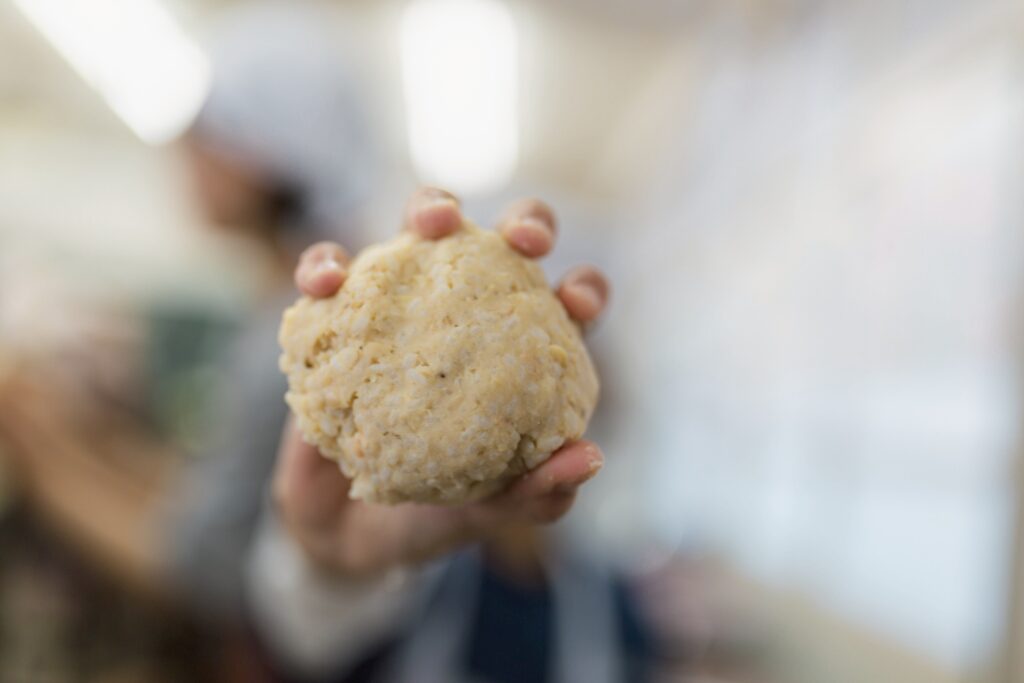 つぶした大豆と塩切り麹を、混ぜます。