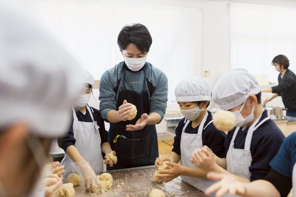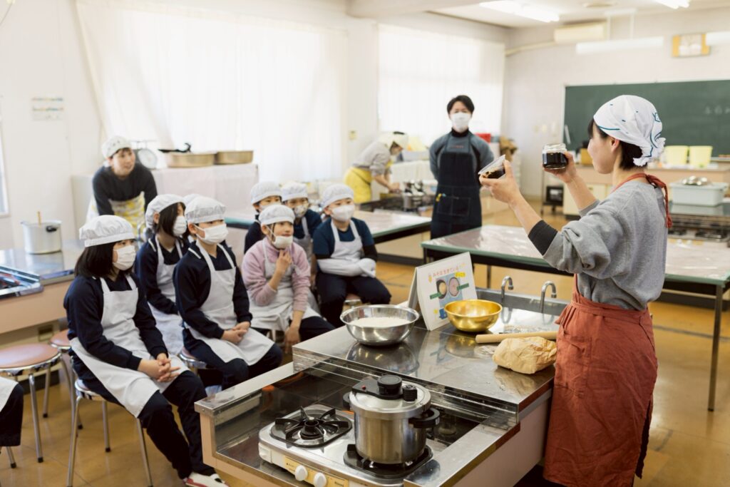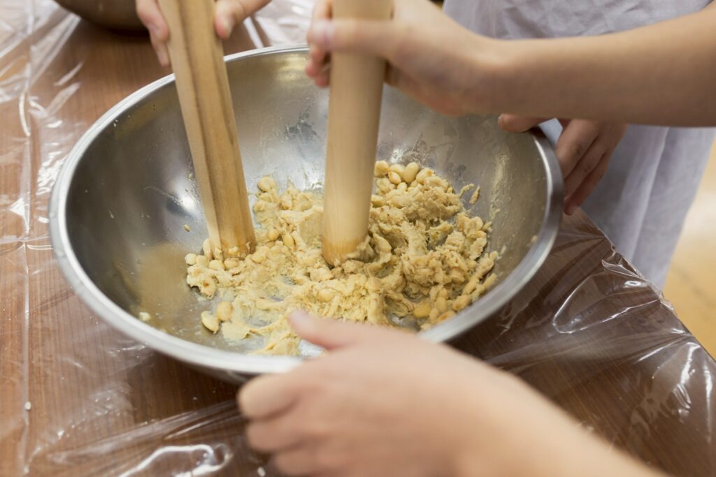 大豆を種から育てた経験。その喜びと、茹でた大豆のぬくもりやつぶした感覚で、一杯の味わいが深まるといいなと思います。3年生で仕込んだお味噌が、麹(こうじ)の力を借りておいしくなる間に4年生になり、さらに熟成したお味噌は5年生の家庭科でのお味噌汁作りに使われます。